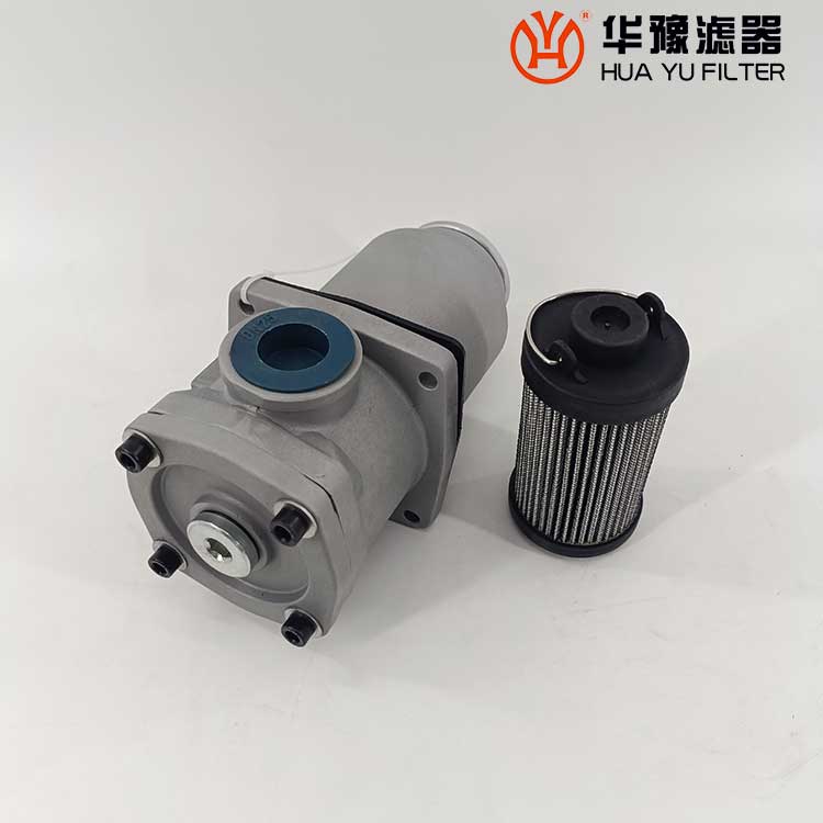 這種過濾器設有濾芯污染堵塞發(fā)訊器和油路旁通閥,當回油壓力達到0.35MPa時,發(fā)訊器發(fā)出開關信號或報警,還可直接從發(fā)訊器的表盤上讀出回油壓力值,以提示操作人員及時更換濾芯,保證系統(tǒng)油液的清潔度。更換濾芯只需旋開過濾器端蓋即可。當回油壓力上升至0.4MPa時,過濾器內的旁通閥便自動卸荷,以避免回油壓力過高造成整個系統(tǒng)工作