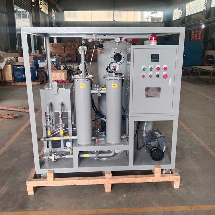真空濾油機(jī)是根據(jù)水和油的沸點(diǎn)不同而設(shè)計(jì)的,它由真空加熱罐、精濾器、初濾器、真空泵、排油泵以及電氣柜組成的。真空泵將真空罐內(nèi)的空氣抽出形成真空,外界油液在大氣壓力的作用下,經(jīng)過(guò)油入口管道進(jìn)入初濾器,清除較大的顆粒,然后進(jìn)入加熱罐內(nèi)經(jīng)過(guò)加熱到40~75℃的油進(jìn)入真空罐內(nèi),油中的水份急速蒸發(fā)成水蒸氣并連續(xù)被真空泵吸入油水分離器內(nèi),分離器內(nèi)的水蒸氣經(jīng)冷卻后還原成水后放出。在真空加熱罐內(nèi)的油液被排油泵排入精濾器通過(guò)濾芯將微粒雜質(zhì)過(guò)濾出來(lái)。從而完成真空過(guò)濾迅速除去油中雜質(zhì)、水份、氣體的全過(guò)程,使?jié)崈舻挠蛷某隹谔幣懦鰴C(jī)外。